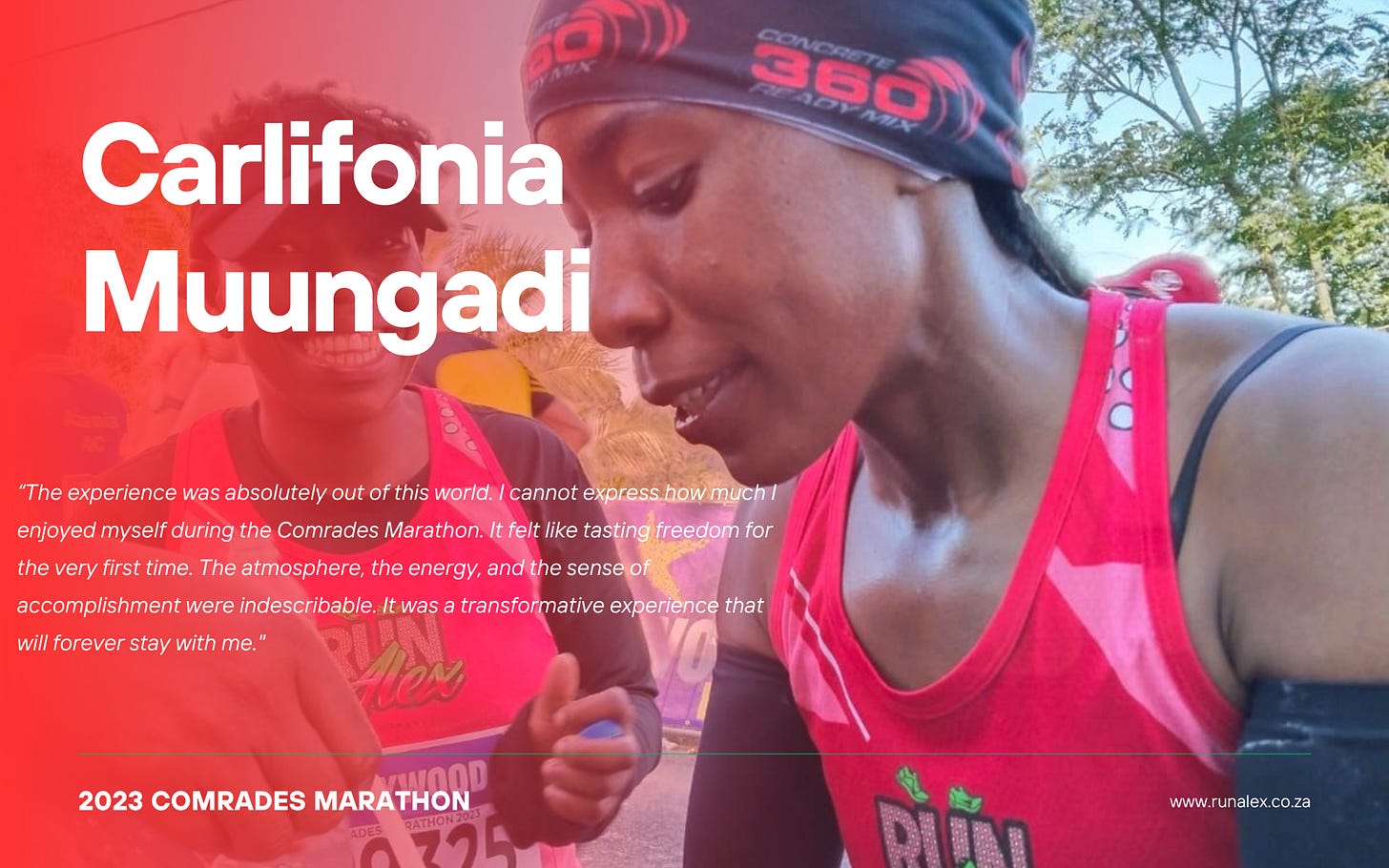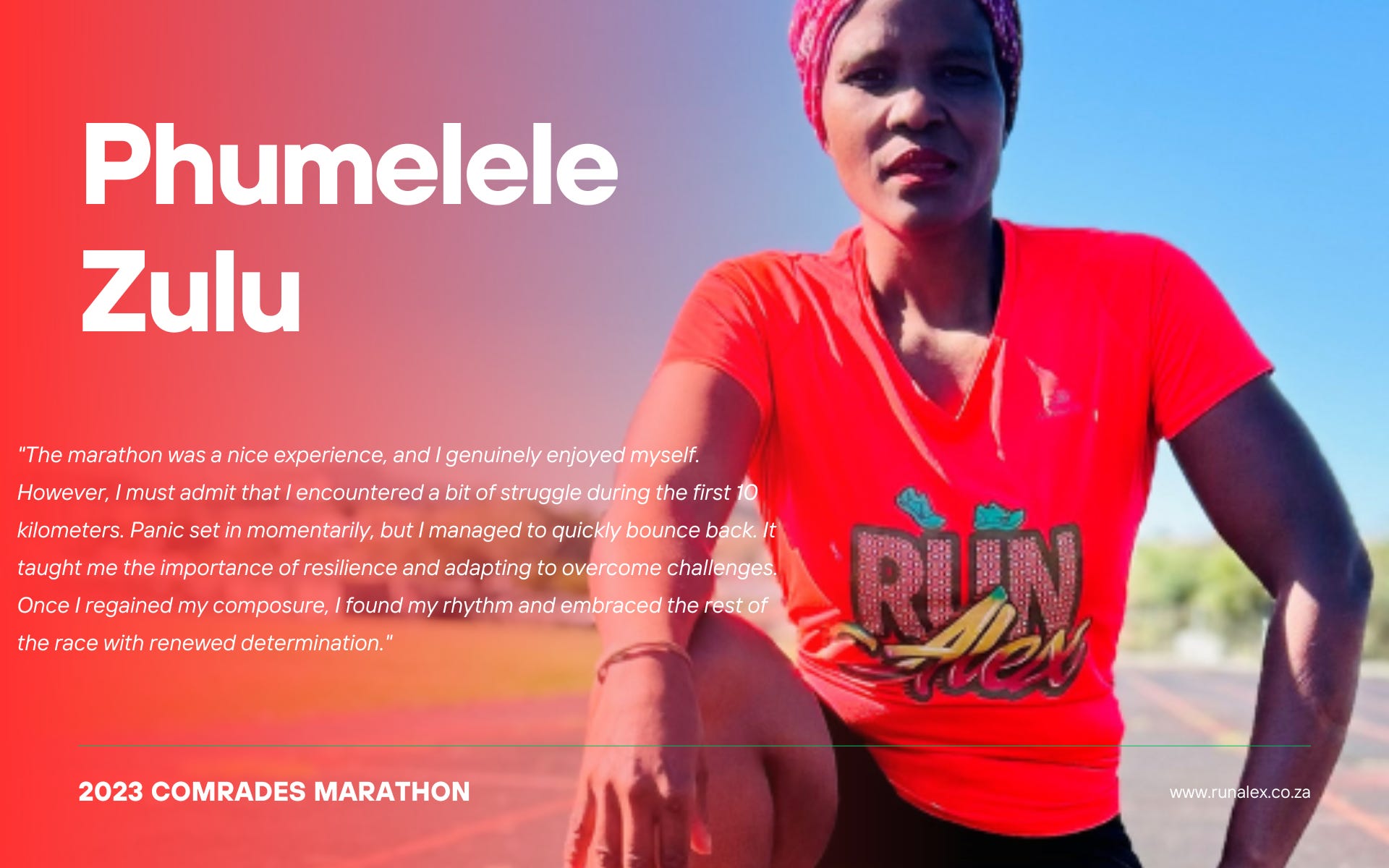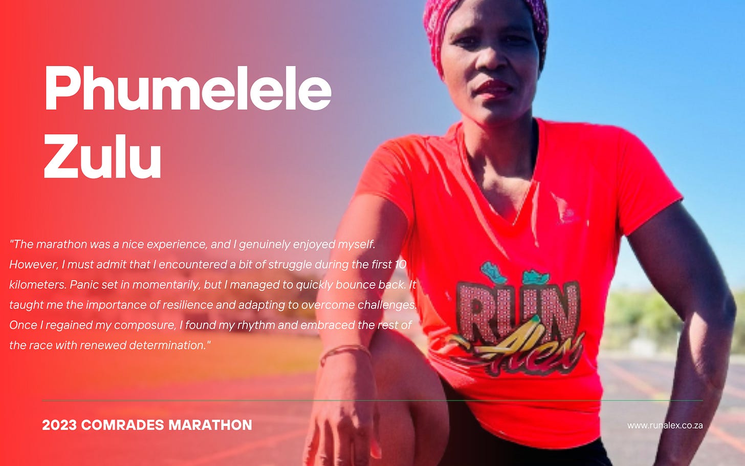 "My running journey began during high school, but it wasn't until my enrollment in RunAlex in 2018 that I truly embraced it wholeheartedly. The unwavering support of my teammates and the love I have for my girls serve as constant motivation. I strive to set a positive example for them, demonstrating that with dedication, perseverance, and belief, no goal is beyond reach. As the Comrades Marathon approaches, I find myself caught between nervousness and happiness. I'm nervous about the enormity of the challenge yet overjoyed at the opportunity to tackle such a significant milestone in my life."
