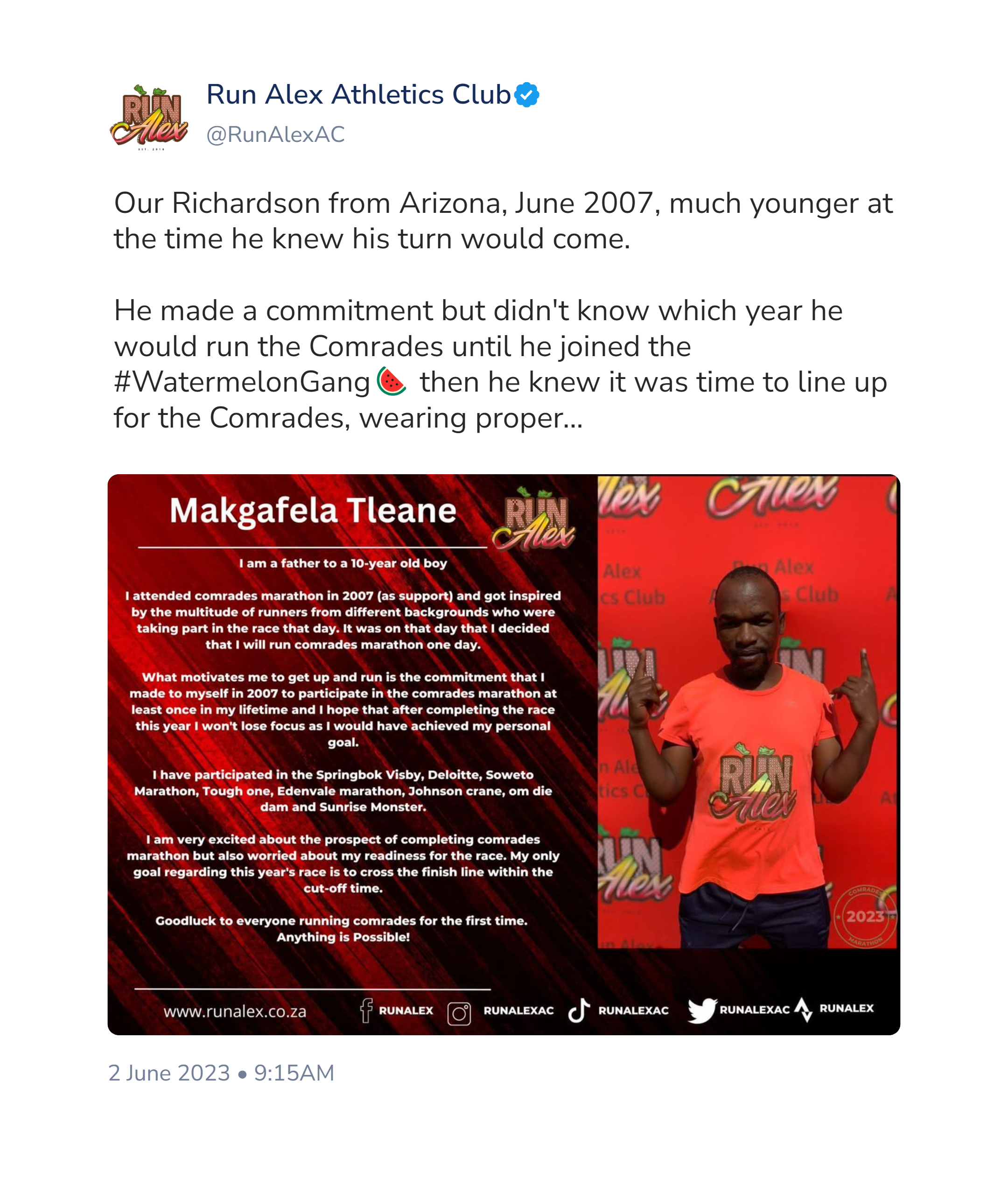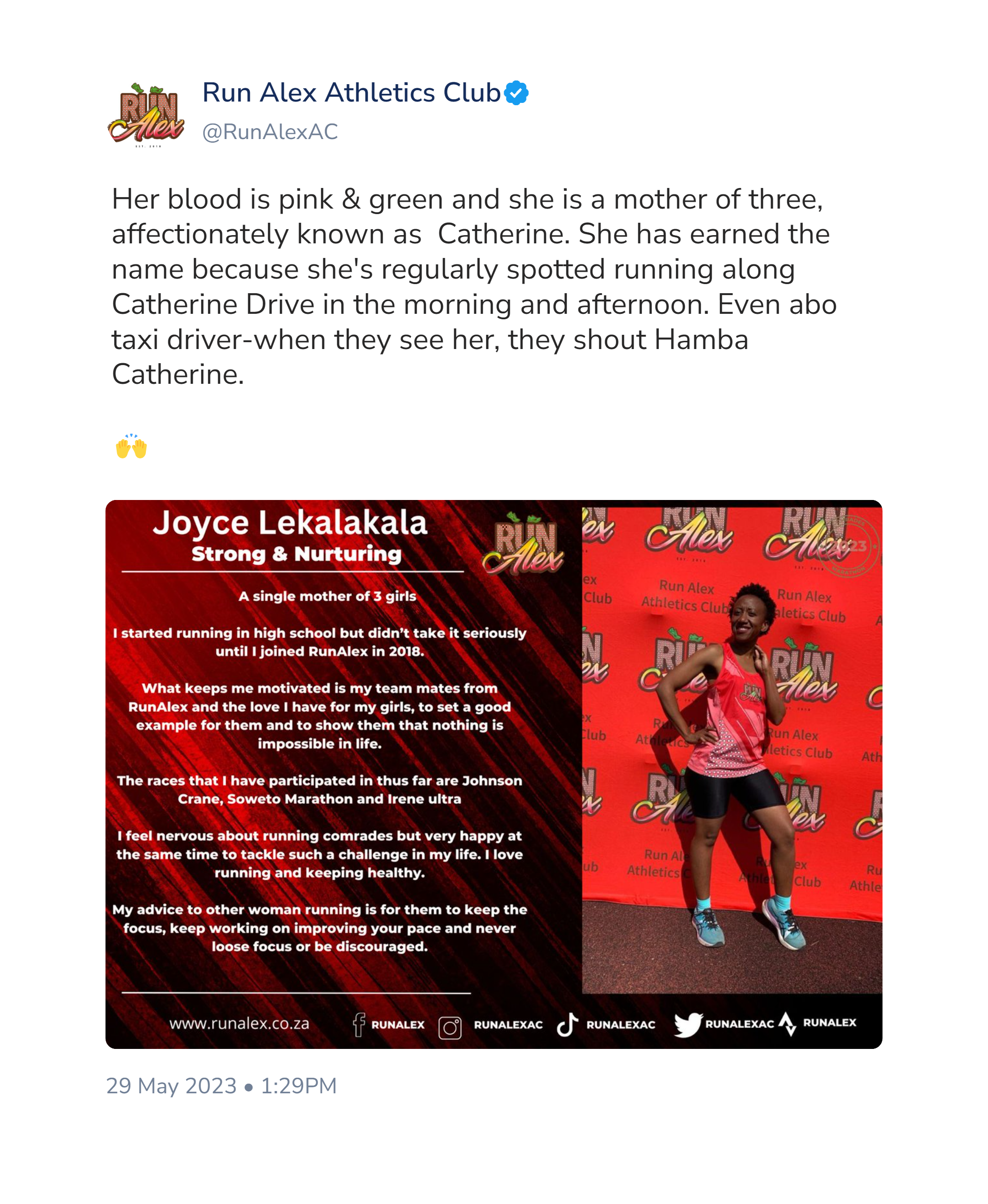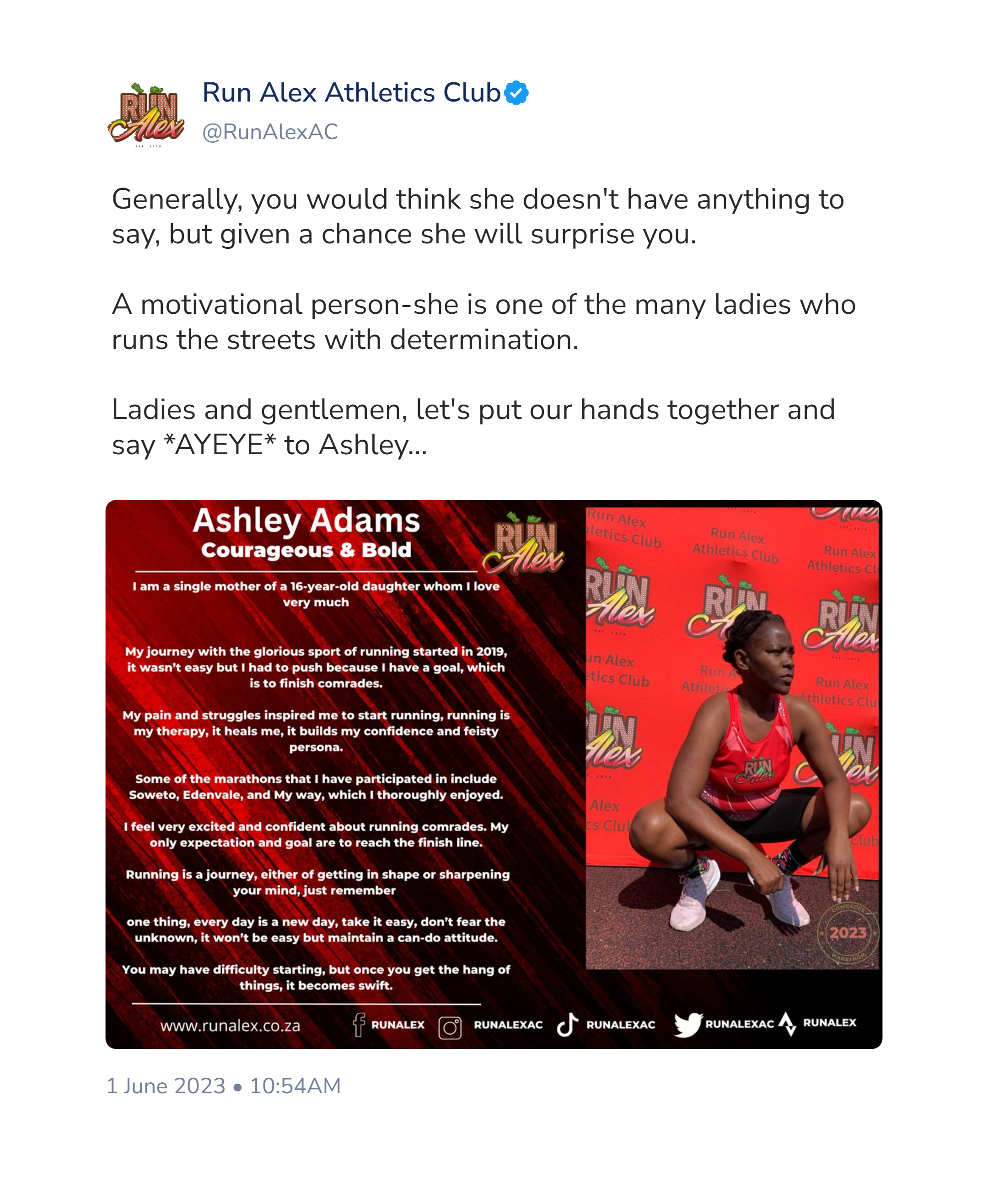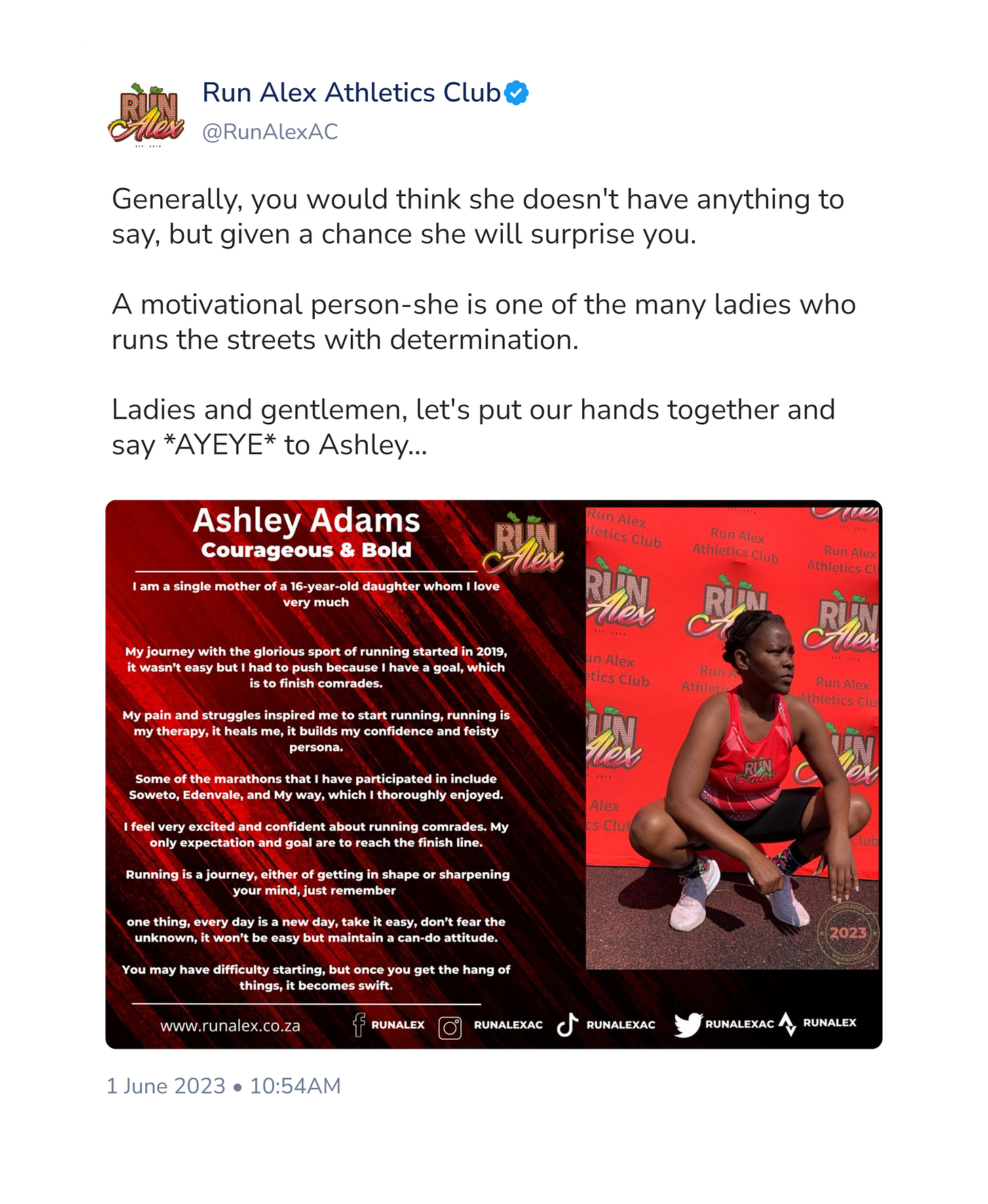 "My running journey began during high school, but it wasn't until my enrollment in RunAlex in 2018 that I truly embraced it wholeheartedly. The unwavering support of my teammates and the love I have for my girls serve as constant motivation. I strive to set a positive example for them, demonstrating that with dedication, perseverance, and belief, no goal is beyond reach. As the Comrades Marathon approaches, I find myself caught between nervousness and happiness. I'm nervous about the enormity of the challenge yet overjoyed at the opportunity to tackle such a significant milestone in my life."